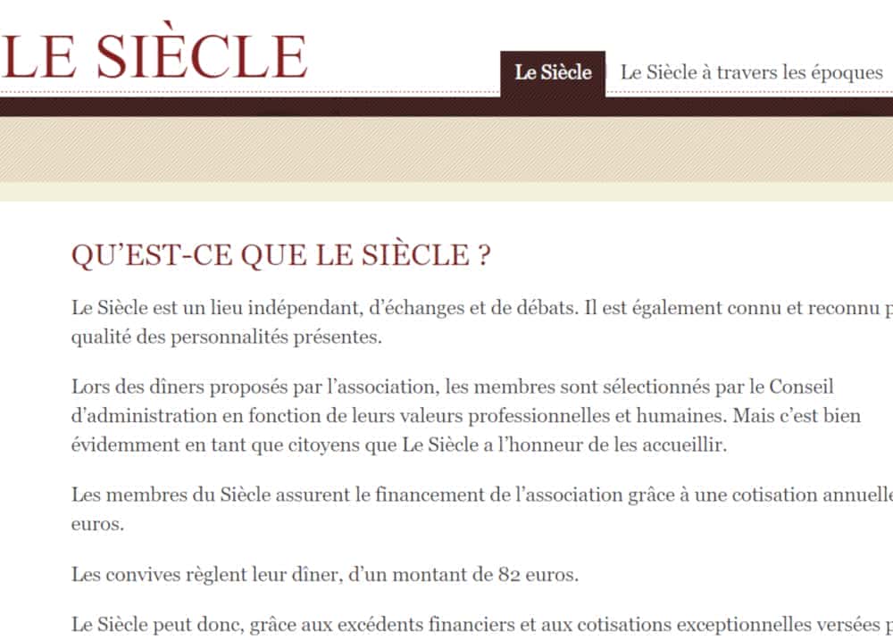 Réputé très influent, le Siècle, écrit le site Capital, « est un endroit très fermé où ses membres, dirigeants politiques, économiques ou culturels français, se regroupent une fois par mois lors d’un dîner au Cercle de l’Union interalliée, au 33 rue du Faubourg-Saint-Honoré (Paris). Ils ont un mot d’ordre : ne rien répéter de ce qui se dit entre eux. »