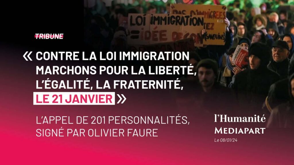 Dans une tribune publiée dans l’Humanité et Mediapart, 201 personnalités issues du monde politique, syndicale et artistique ont appelé à manifester le 21 janvier prochain contre la loi Immigration. Le texte demande à Emmanuel Macron de ne pas promulguer cette loi, s’inquiétant d’un « tournant dangereux dans l’histoire de notre République ». Zoom.