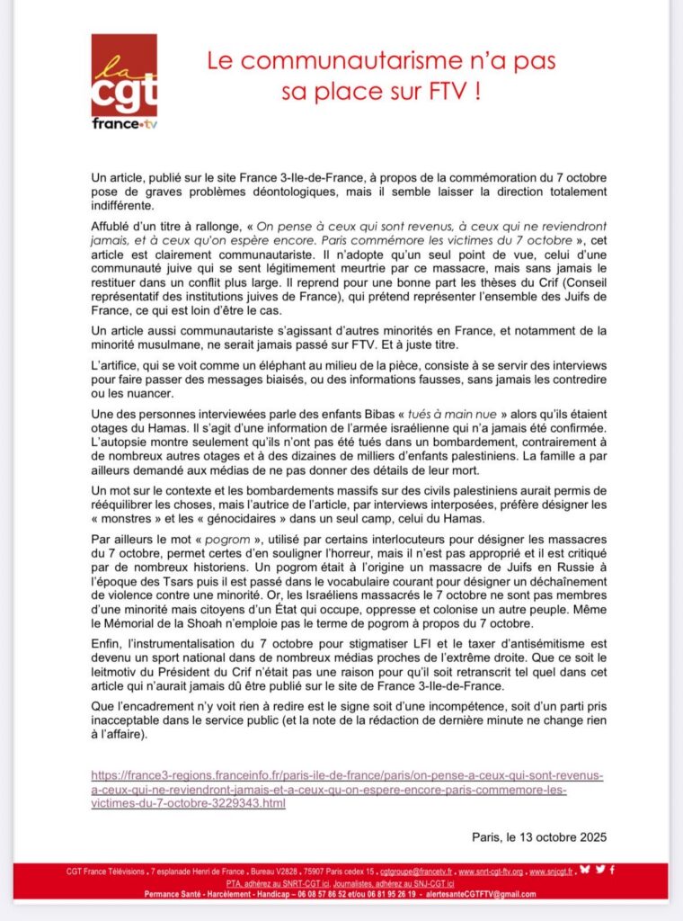 La centrale syndicale de France Télévisions a publié un communiqué intitulé « Le communautarisme n’a pas sa place sur FTV », dans lequel elle déplore qu’un article diffusé sur le site de France 3 Île-de-France reprenne le narratif partial d’Israël sans replacer le « conflit israélo-palestinien » dans son contexte historique.