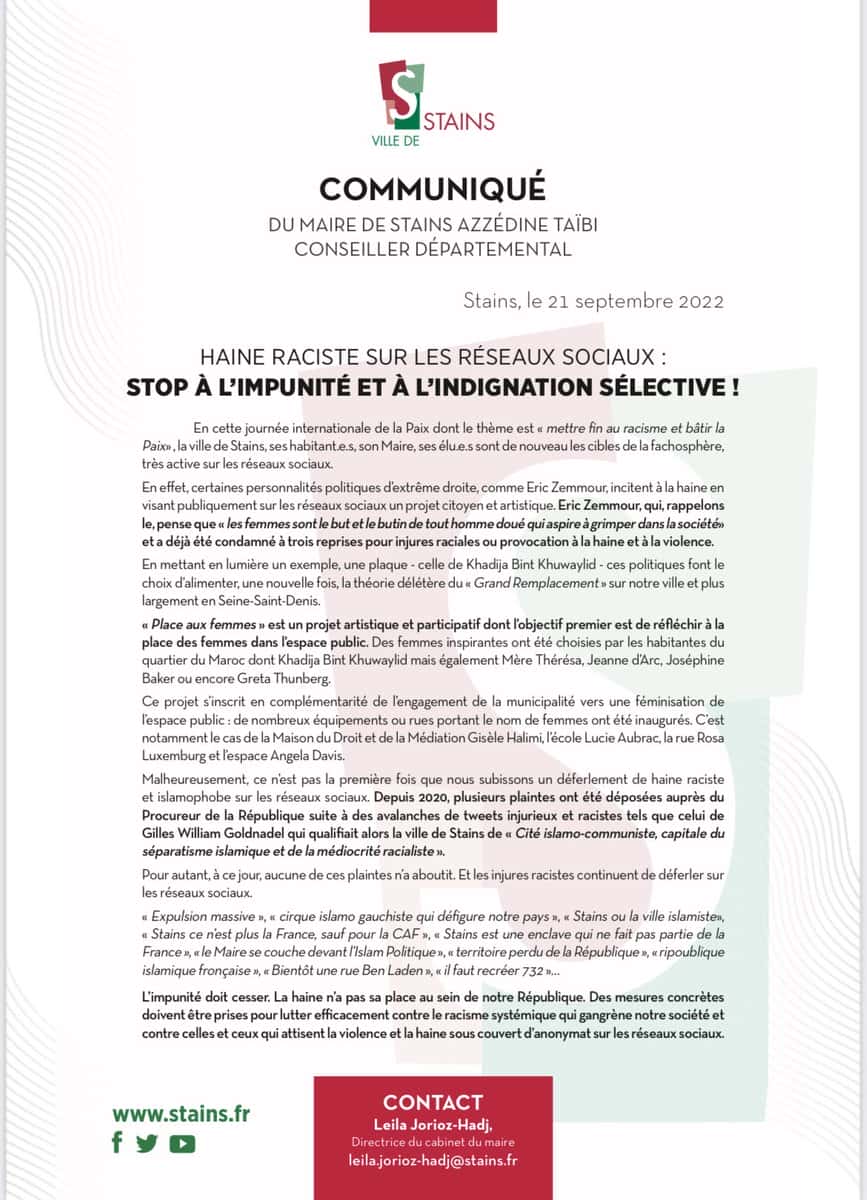 Azzedine Taïbi, le nouveau maire de Stains persiste et signe. « C’est un projet éphémère, comme on en mène des dizaines dans le domaine de la culture et auquel CDC Habitat, la Drac (Direction régionale des affaires culturelles) et Plaine Commune sont associées », déclare-t-il dans les colonnes du Parisien. L’élu, dont la ville a déjà prise en grippe par des campagnes de médias télé surfant sur le sensationnalisme, a défendu l’initiative et dénonce dans un communiqué une campagne raciste de la fachosphère.