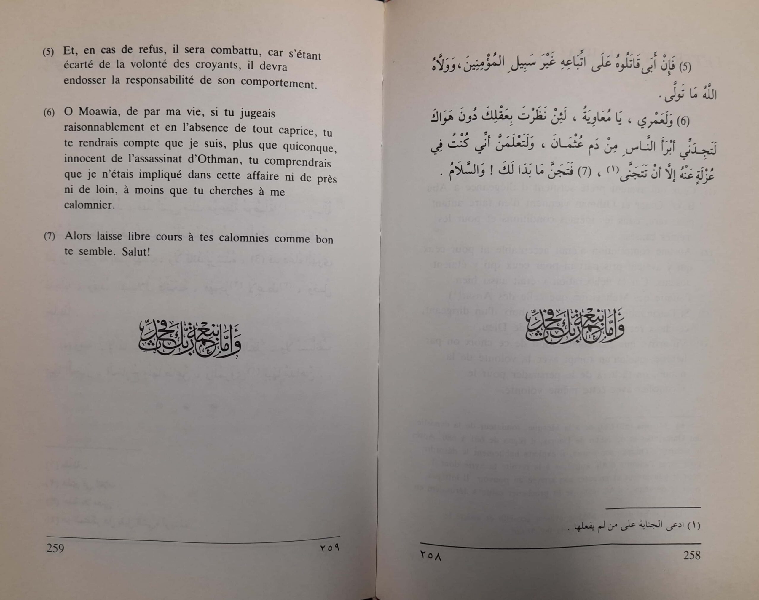 a fortiori que telle ne semblait pas être l’opinion tardive de l’imam ‘Ali, premier des imams chiites, selon les termes de la première lettre à Mou’awiyya qui lui est attribuée, et qui figure dans le recueil célèbre