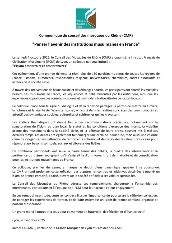Sous l’impulsion du CMR, une organisation régionale du culte musulman est en train de voir le jour : le Conseil de coordination des institutions musulmanes de la région Auvergne-Rhône-Alpes. « Ce colloque, premier du genre, a marqué le début d’une dynamique appelée à se poursuivre », souligne le communiqué du CMR, qui souhaite prolonger la réflexion par d’autres initiatives « destinées à nourrir un islam de France enraciné, apaisé et ouvert sur la société ».