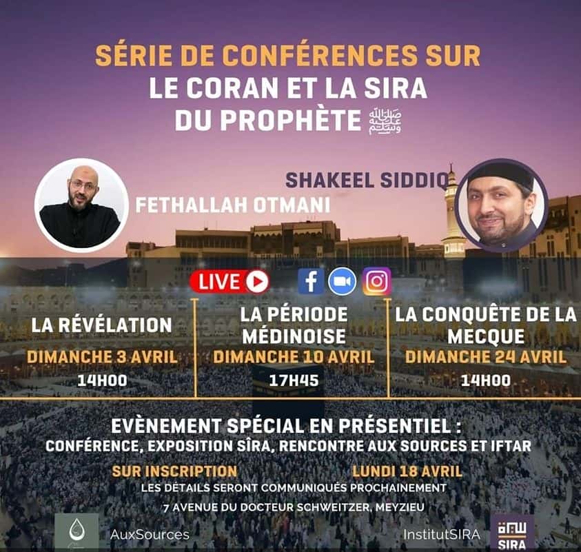 Toujours à Lyon, une série de conférences sera donnée le 18 avril avec Shakeel Siddiq et Fethallah Otmani les dimanche 3, 10 et 14 avril sur le Prophète (PBDSL). Toutes les informations sont disponibles sur l’affiche ci-dessous.