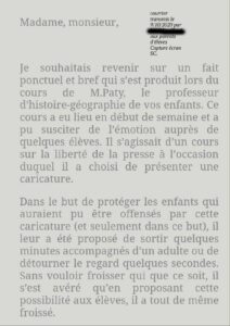 Deux hypothèses sont envisageables : une autre classe de quatrième a reçu, selon nos informations, le même cours de présentation des caricatures, à une date indéterminée.
