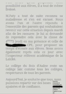 L’établissement reconnaissait une maladresse de l’enseignant et s’en excusait. Un temps d’écoute a été proposé avec un inspecteur académique référent en matière de laïcité et à l’attention des parents qui souhaitaient revenir sur cet enseignement.