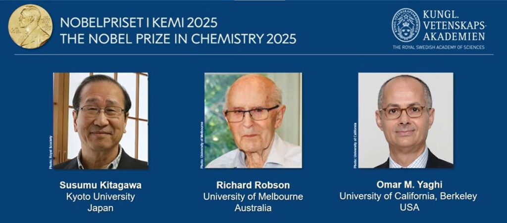 Ce mercredi 8 octobre, le prix Nobel de chimie 2025 a été attribué à un trio composé du Japonais Susumu Kitagawa, du Britannique Richard Robson et de l’Américano-Jordanien Omar M. Yaghi pour leurs travaux sur « le développement d’une forme complètement nouvelle d’architecture moléculaire ».