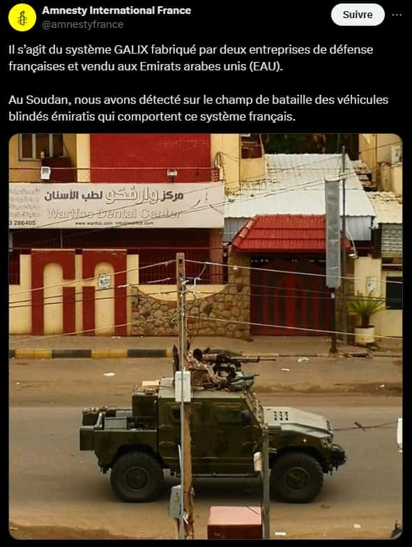 Selon l’ONG, des véhicules de transport de troupes Nimr Ajban, fabriqués aux Émirats arabes unis par le groupe Edge, sont employés par les Forces de soutien rapide (FSR) du général Mohammed Hamdan Daglo. Ces blindés sont équipés du système d’autoprotection Galix, conçu par KNDS France et Lacroix.