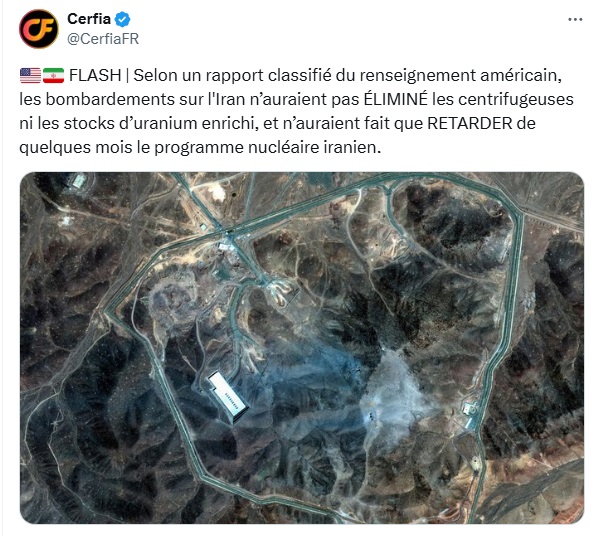 Un premier rapport du renseignement militaire américain estime que les installations nucléaires de Fordo, Natanz et Ispahan « n’ont pas été détruits » : le stock d’uranium enrichi serait « intact », tout comme une partie des centrifugeuses. Les trois sites ciblés ont surtout été touchés en surface, indique CNN. Malgré l’authentification du rapport, la Maison-Blanche conteste.