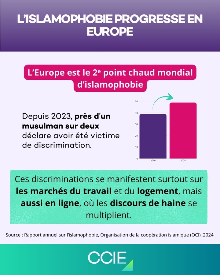 Les actes antimusulmans dans l’Union européenne ont fortement augmenté depuis octobre 2023, notamment en Autriche, en Belgique et en Bulgarie. Près d’un musulman sur deux en Europe affirme avoir déjà subi une forme de discrimination. Ces discriminations touchent surtout le logement et l’emploi, mais s’étendent aussi aux espaces numériques, où les discours de haine se multiplient.