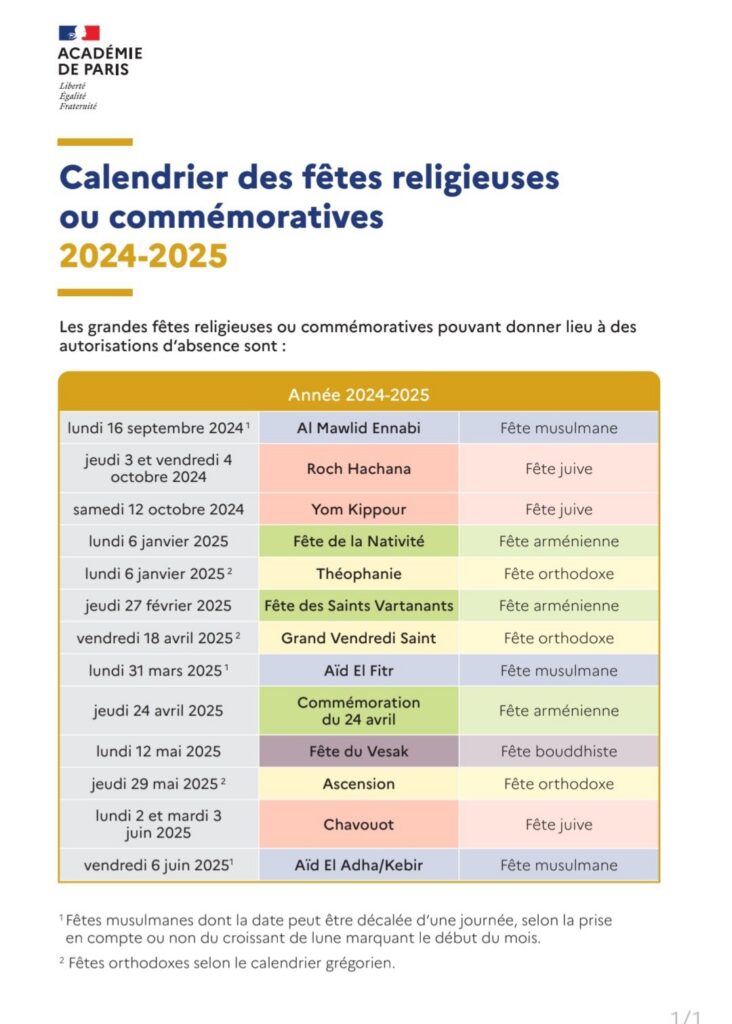 En effet, l’absence des enseignants pour des fêtes religieuses est parfaitement encadrée par la loi. Une circulaire du 10 février 2012 rappelle que « les chefs de service peuvent accorder aux agents qui désirent participer aux cérémonies célébrées à l’occasion des principales fêtes propres à leur confession, les autorisations d’absence nécessaires ».