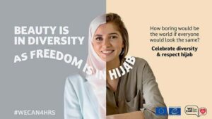 « À quel point le monde serait ennuyeux si tout le monde se ressemblait ? », « la beauté dans la diversité », « Mon voile mon choix », « la liberté dans le hijab ». Tous ces messages faisaient partie d’une campagne d’affiches promues par le Conseil de l’Europe en faveur de la diversité et de la liberté de conscience dans le cadre du programme «Droits, Égalité et Citoyenneté» dont le but est de veiller à ce que «l’égalité et les droits des personnes tels qu’ils sont inscrits dans le Traité, la Charte et les conventions internationales des droits de l’homme, soient promus, protégés et effectivement mis en œuvre».