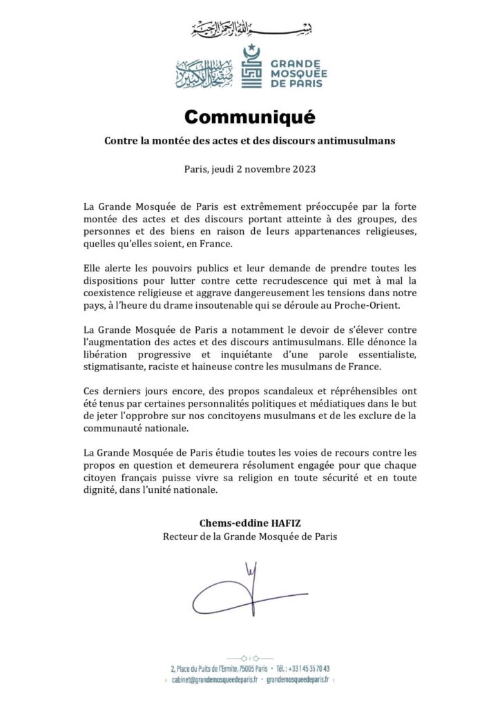 Dans un climat actuel fortement impacté par les évènements en Palestine, l’institut se dit extrêmement préoccupée par « l’augmentation des actes et des discours antimusulmans ». La Grande Mosquée de Paris dénonce « la libération progressive et inquiétante d’une parole raciste et haineuse contre les musulmans de France ».