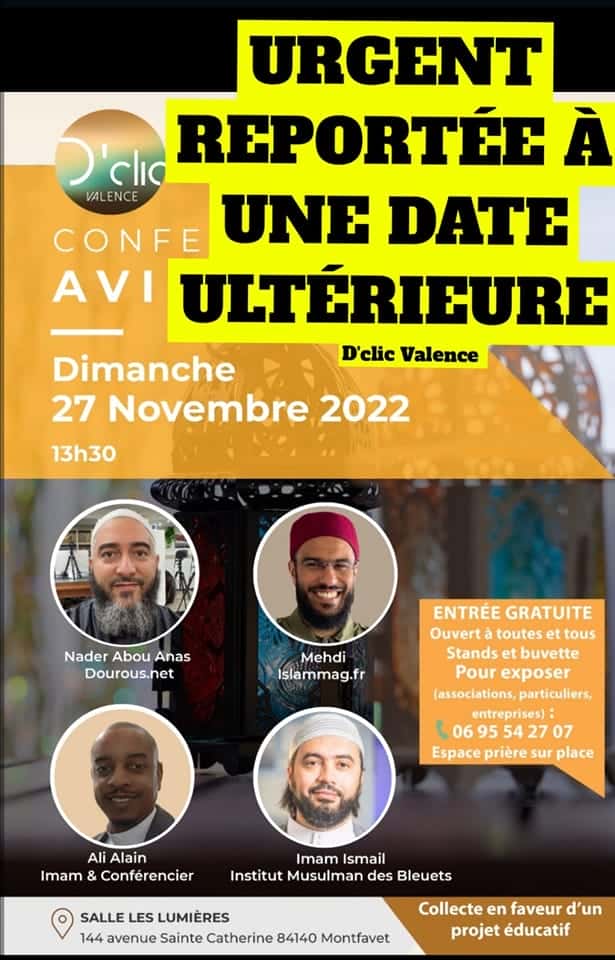 Ce dimanche 5 mars, une conférence réunissant l’imam Ismail de Marseille, Vincent Souleymane et trois autres prédicateurs musulmans a été annulée par arrêté municipal confirmé par le tribunal de Versailles.