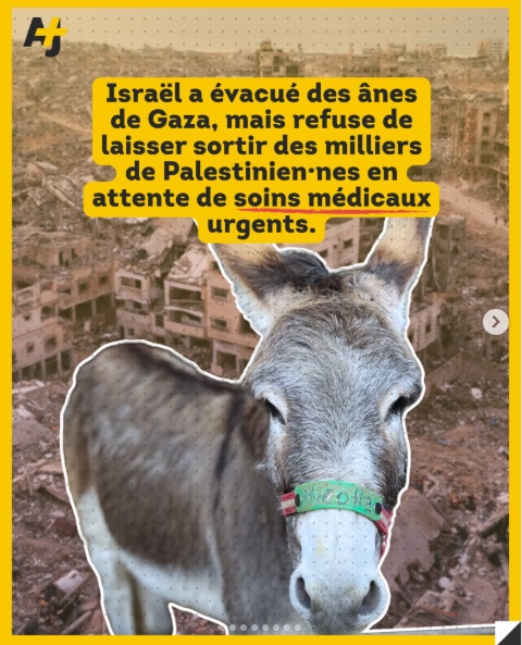 Loin d’être maltraités ou abandonnés à leur sort, les animaux malades et blessés de Gaza sont soignés et secourus. Un article du Guardian, paru en avril 2025, soulignait qu’une seule équipe médicale avait secouru plus de 7 000 ânes depuis octobre 2023. Par ailleurs, le journaliste Tarek Baé indiquait sur X que, selon l’ONU, dès août 2024, 43 % du cheptel de Gaza avait péri dans les ravages du génocide menée par Israël.