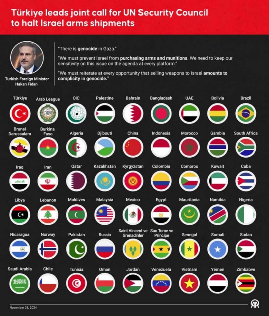 Envoyée à l’ONU, la lettre conjointe appelle « collectivement à des mesures immédiates pour arrêter la fourniture ou le transfert d’armes, de munitions et d’équipements liés à Israël, la puissante occupante ». « Vendre des armes à Israël signifie participer à son génocide », a ajouté le ministre turc Hakan Fidan.