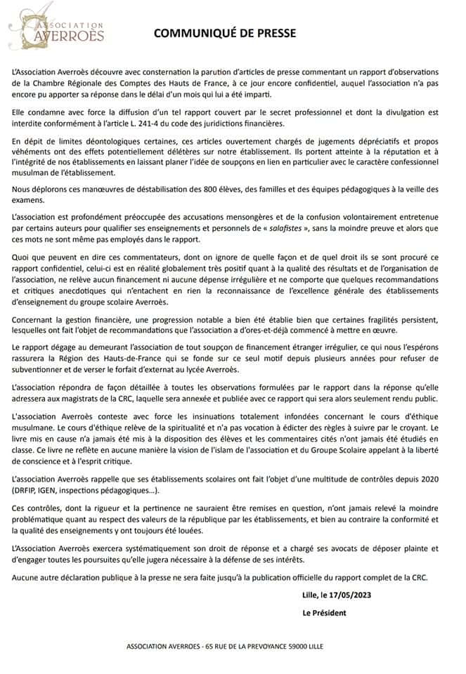 Devenu en 2008, le premier lycée musulman sous contrat d’association avec l’Etat français, l’établissement Averroès – reconnu pour son « excellence académique » avec ses 100 % de réussite au Bac – a fait l’objet d’un rapport de la chambre régionale des comptes des Hauts-de-France (CRC) évoquant la gestion financière « critique » de l’établissement.