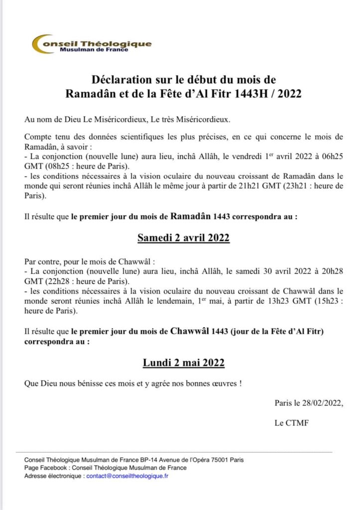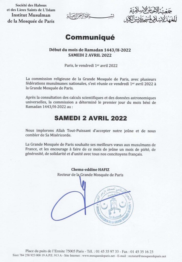 Ce sera samedi ! Le premier jour de Ramadan 2022 a été annoncé pour ce 2 avril par le CFCM, l’Institut de la Grande Mosquée de Paris et le Conseil théologique Musulmans de France par divers communiqués. Des annonces qui rejoignent celle faite par l’Arabie saoudite et un certain nombre de pays musulmans. A l’exception cependant de l’Indonésie, de la Malaisie et de Oman qui devrait débuter leur jeûne ce dimanche. L’ensemble de la rédaction de Mizane.info vous souhaite à tous et à toutes un très bon mois de Ramadan et vous invite à suivre toutes les publications et vidéos que nous publierons à cette occasion.