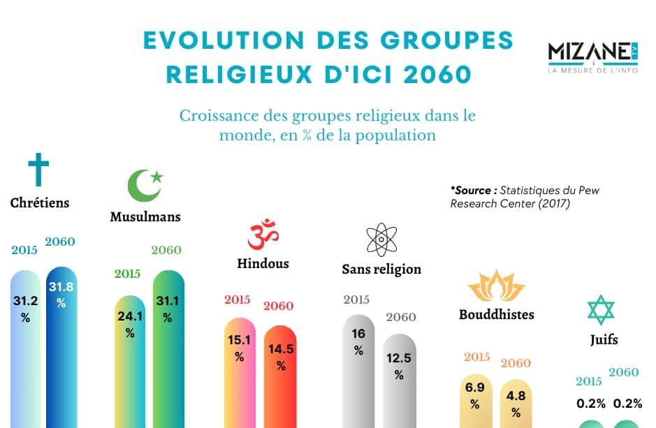 Si le pourcentage des personnes n’adhérant à aucune religion est en hausse dans les pays occidentaux, la situation pourrait s’inverser dans les années à venir. D’après des projections du Pew Research Center, la part de la population mondiale adhérant à des religions sera en constante augmentation d’ici 2060. Les musulmans connaitront la croissance la plus rapide. Le zoom de Mizane.info.