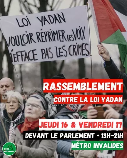 Plusieurs rassemblements sont prévus en France le 16 avril pour protester contre la loi Yadan. À Paris, des mobilisations sont annoncées les jeudi 16 et vendredi 17 avril au métro Invalides, à proximité de l’Assemblée nationale.