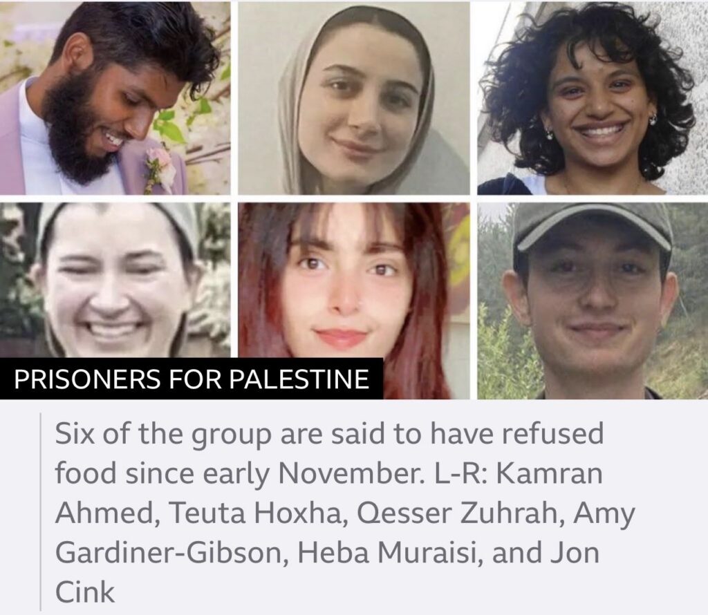 Kamran Ahmed, 28 ans, incarcéré à la prison de Pentonville, à Londres, a été hospitalisé le samedi 20 décembre. Il en était alors à son 42ᵉ jour de grève de la faim. Amu Gib, 30 ans, détenue à la prison de Bronzefield, dans le Surrey, a également été hospitalisée vendredi dernier, a annoncé le collectif Prisoners for Palestine. Elle n’avait pas mangé depuis cinquante jours.