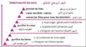 Un poète a ainsi dit : La générosité de l’homme le fait aimer même auprès de ses adversaires Alors que l’avarice le fait détester auprès de ses propres enfants. C’est l’avarice qui fait apparaître les défauts de l’individu aux autres Alors que la générosité les voile tous. Alors, drape-toi par l’habit de la générosité En effet, tous les défauts en sont ainsi cachés. Le partage provient de la générosité, logée dans le cœur. Elle en est son expression la plus évidente. Le partage devient ainsi une valeur centrale en islam. Il est indice et voie vers l’amour de Dieu. Il prend, en islam, des formes insoupçonnées. C’est dire que les portes du partage sont innombrables et que n’y entrent pas les durs de cœur. Le partage n’est pas seulement dans le fait de donner de ses biens. C’est une notion bien plus vaste en islam. En effet, il s’agit de donner de son écoute, de son temps, de sa force, de son savoir, de son intelligence, de sa patience… « Et offrent la nourriture –quelque amour qu’on porte aux biens– au pauvre, à l’orphelin et au prisonnier, (disant) :  C’est pour le visage de Dieu (Son amour) que nous vous nourrissons : nous ne voulons de vous ni récompense ni gratitude. » [Coran 76/8-9] L’enseignement prophétique suivant est en écho au verset : « Toute personne se retrouvera à l’ombre de son aumône [le Jour dernier] jusqu’au jugement entre les gens. » En entendant cette parole, le Compagnon Abû l-Khayr donnait chaque jour une aumône et s’il ne trouvait rien à donner, il donnait un biscuit[4] ou même un oignon. [Ibn Khuzayma, sahîh] Le remerciement (shukr) est le pendant de la foi, cette dernière étant d’abord reconnaissance puis remerciements à Dieu. Et l’ingratitude est le pendant de l’incroyance (kufr). En effet, la reconnaissance et le remerciement sont donnés en langue arabe par un seul mot : shakara, car qui reconnaît, remercie. Et de même, la non reconnaissance et la mécréance sont données par un seul mot : kafara (كفر), celui qui ne reconnaît pas les bienfaits de Dieu risque d’aller à l’incroyance. Remercier Dieu, en reconnaissant Ses faveurs et bienfaits, est donc le premier pas de la foi. C’est une attitude qui accompagne le croyant durant toute sa vie et sur tous les aspects de la vie, car Ses bienfaits et faveurs touchent tous les aspects de notre vie. Et parmi Ses faveurs, la foi qui nous habite, les prières et les dons qu’Il nous aide à accomplir etc. Et dans ce cadre, le don de ce qu’Il nous a donné constitue une forme de reconnaissance et de remerciement (shukr). L’enseignement prophétique suivant est tout-à-fait extraordinaire : « Celui qui ne remercie pas pour le peu, ne remerciera pas pour bien plus. Celui qui ne remercie pas les gens ne remerciera pas Dieu. Parler des bienfaits de Dieu est déjà un remerciement (reconnaissance). Celui qui ne le fait pas ne reconnaît pas le don de Dieu. … » [authentifié par Albânî]