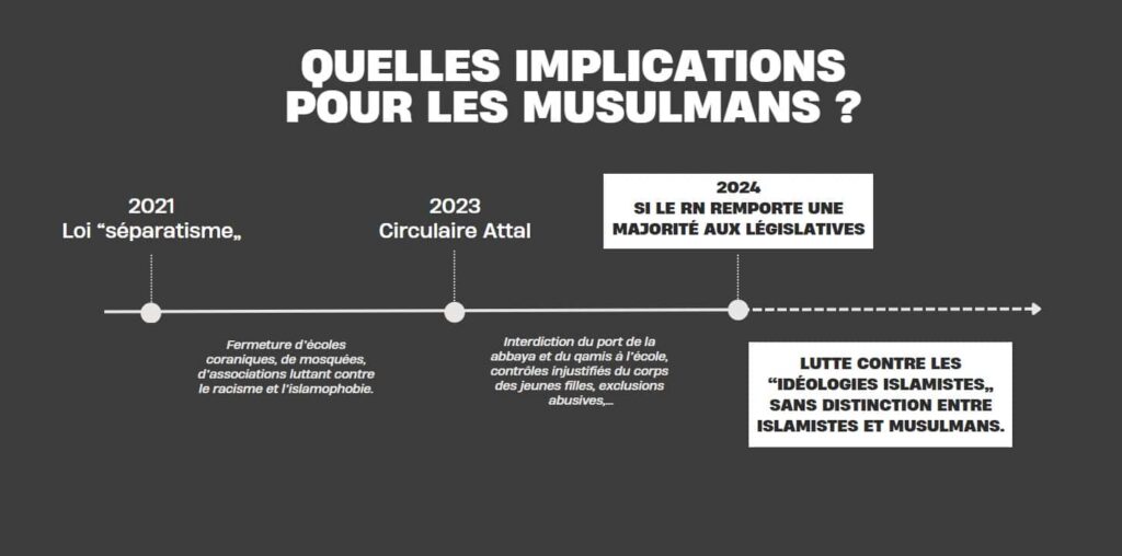 Après avoir énuméré les mesures phares du RN « impactant directement les musulmans en France » (à l’interdiction du voile dans l’espace public, fermeture de mosquées, d’instituts et d’écoles privées musulmanes…), la tribune souligne que ces « mesures auraient des conséquences graves et directes sur la vie quotidienne des musulmans en France ».