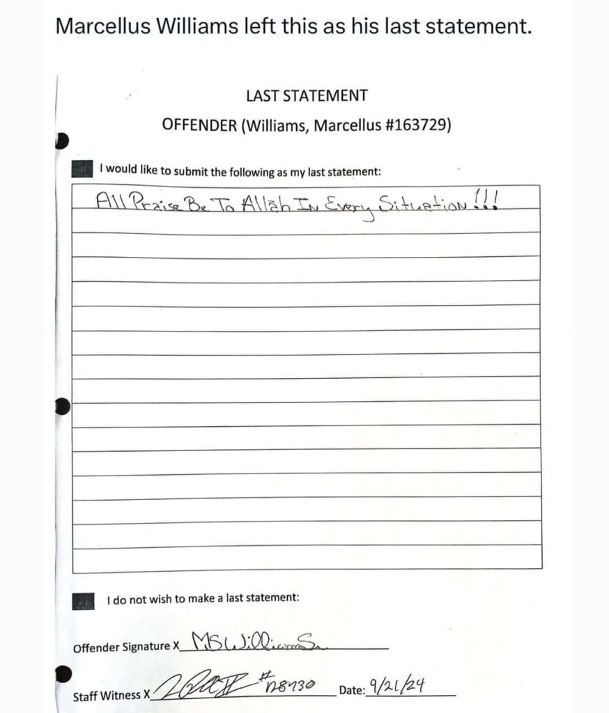 C’est par ces mots que s’est exprimé, peu après l’exécution, Larry Komp, l’un des avocats à la défense. Marcellus « Khaliifah » Williams, 55 ans, a été tué par injection létale, mettant fin à une bataille juridique qui a suscité une vague d’indignation généralisée.